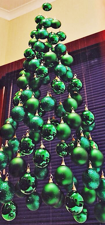 Befestige deine Lieblings Weihnachtskugeln ganz einfach an einer Platte und Hänge sie mit einer Angelschnur von deiner Decke. Symmetrie nicht vergessen - nutze dafür am besten Lineal und Stift für gleichmäßige Abstände der Kugeln.